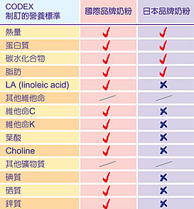 現時國際間廣泛認可的「嬰兒奶粉標準」是按聯合國與世界衛生組織成立的國際食品法典標準﹝Codex Alimentarius,簡稱Codex﹞,當中提供各項營養素如脂肪、維他命、礦物質等的具體含量。至於日本嬰兒奶粉,只是遵照日本本土衛生部的監管標準去製訂,於配方或標籤上亦欠缺Codex指引嬰兒奶粉所需多種營養素﹝見附表一﹞。