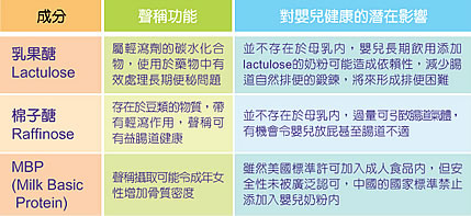 另外,有傳飲日本奶粉的嬰孩不容易有便秘問題,可能只是與其成份有關,因為有分析指部份日本奶粉含有乳果醣﹝Lactulose﹞及棉子醣﹝Raffinose﹞,皆是會引發輕瀉情況的寡醣類物質。家長需留意這些寡醣類物質並不存在於母乳中,亦絕非Codex或其他國際機構﹝如美國食品及藥品管理員USFDA﹞認可可以加入嬰兒奶粉的安全成份,可能對嬰兒的健康存在影響﹝見附表二﹞。